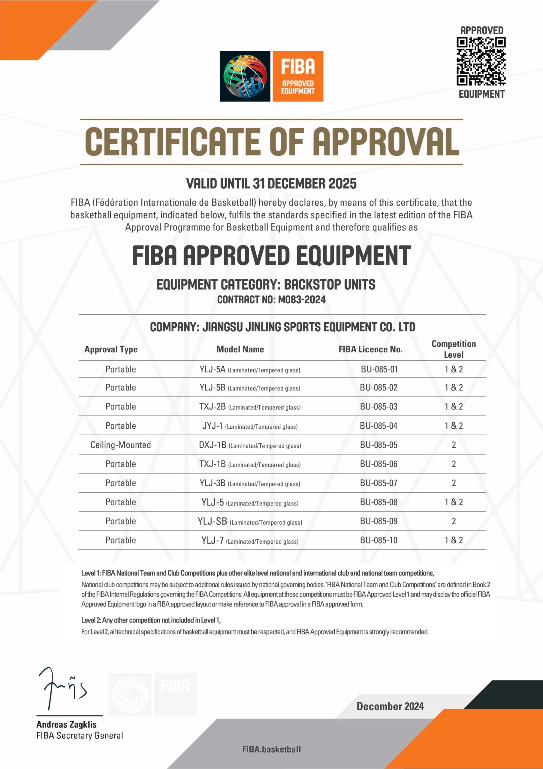 National club competitions may be subject to additional rules issued by national governing bodies. ‘FIBA National Team and Club Competitions’ are defined in Book 2 of the FIBA internal Regulations governing the FIBA Competitions. All equipment at these competitions must be FIBA Approved Level 1 and may display the official FIBA Approved Equipment logo in a FIBA approved layout or make reference to FIBA approval in a FIBA approved form.