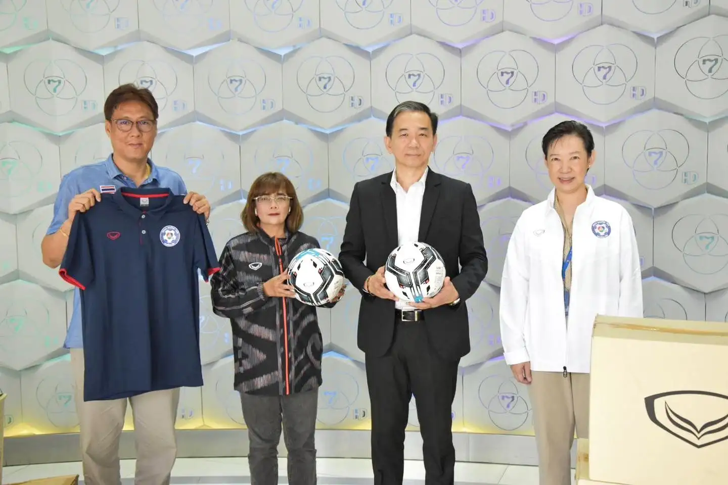 คุณพัฒนพงค์ หนูพันธ์ กรรมการผู้จัดการ บริษัทกรุงเทพโทรทัศน์และวิทยุ จำกัด (CH7HD) พร้อมด้วย คุณสุณี ปริปุณณะ ผู้ช่วยกรรมการผู้จัดการ และรักษาการผู้จัดการฝ่ายธุรกิจโฆษณา ร่วมถ่ายภาพ และ #รับมอบเสื้อผ้ากีฬาแกรนด์สปอร์ตและลูกฟุตบอลรุ่นลีก_LEAGUE ที่จะใช้ในการแข่งขันฟุตบอลรายการ #แชมป์กีฬา_7_HD_Champion_Cup_2024 อย่างเป็นทางการ จากคุณชิดชนก โพธิ์อ่อง ผู้จัดการแผนกประชาสัมพันธ์ ในฐานะตัวแทนบริษัท แกรนด์สปอร์ต กรุ๊ป จำกัด ที่อาคาร 2 สถานีโทรทัศน์สีกองทัพบกช่อง 7 หมอชิต